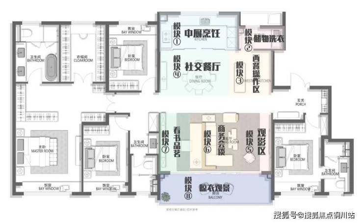 市面上,餐客厨阳台四大空间基本上只配置4-5个功能性公区。而象屿恒泰·天誉东方二期建面约236㎡做到了8个场景空间,既融合又独立,简直是神仙设计!