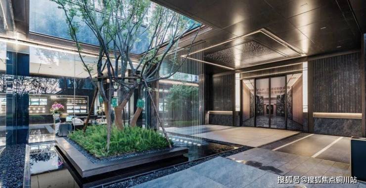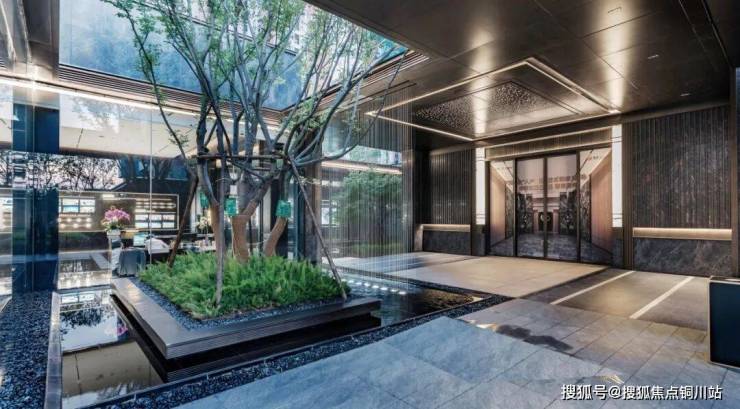 首层单元大堂与风雨连廊的设计手法融合统一,采用仿石砖嵌金属条的形式,在入口电动门两侧设置发光云石灯柱,顶部吊顶设置星光顶,形成场域化的同时增加昭示性。议事厅两侧结合单元入口分别设置了两个小庭院,加之景观水帘、金属网帘的设计为入口和架空层增添更多自由与愉悦。