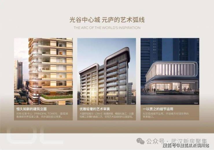 2、艺术弧形立面:国内一线建筑设计机构,詹天佑奖获得者:承构建筑,以伦敦伦金中心为艺术灵感,采用哑光香槟金铝板、大面积玻璃、石材等品质用材,以及弧形转角、凹槽切割等严苛工艺,打造富有豪宅辨识度的高颜值立面,铝板防雨水流挂腐蚀,历久弥新可保障二手房的增值溢价。