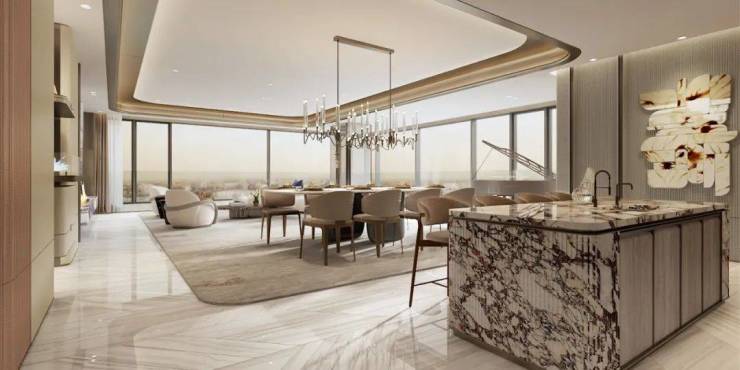 新希望·D10黑珍珠传袭建面约310㎡,客餐厅约90㎡LDK+G四大公共空间洄游式布局,延伸复合型社交主场,落地幕墙体系超大景观尺度,U型连续落地玻璃幕墙,约50M巨幅无遮观江面阔境大面宽,蓝丝绸奢石电视背景墙彰显气质。