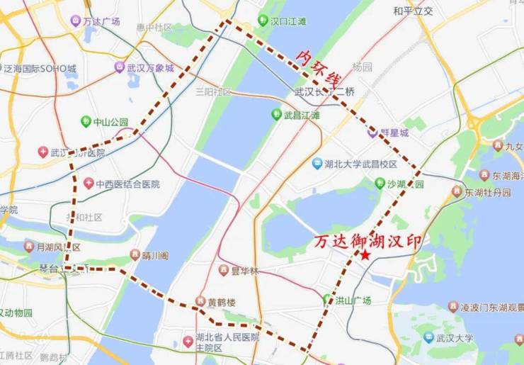万达御湖汉印位于楚汉路与中北路交汇处以东,楼市划分属于中北路板块,行政划分属于武昌区,内环线上。