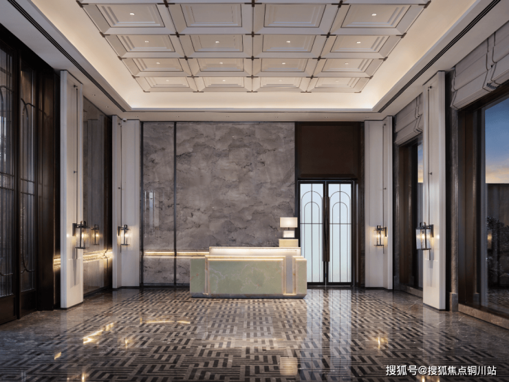 进入内部,挑空的入户大堂,墙壁采用整面艺术奢石及独特的吊顶造型装饰,透露出低调又尊贵的归家体验。