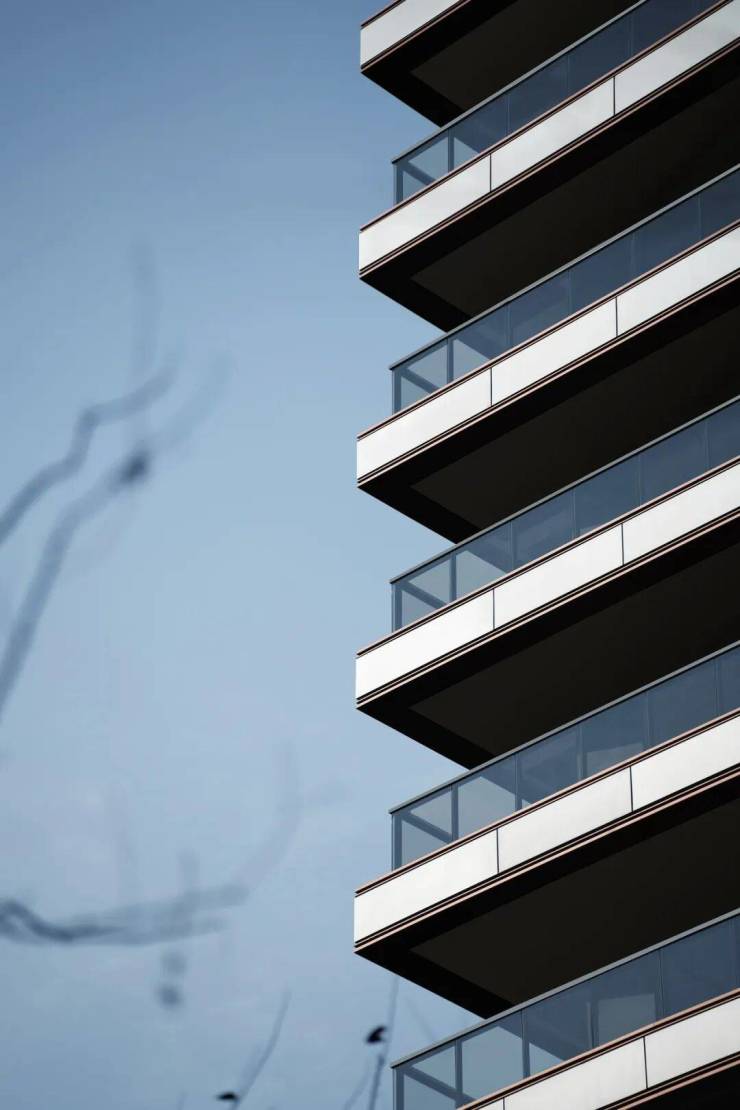 细节上,呈现出独具一格的丰富层次,阳台3层暖色金属边框,好像“三眼皮”层层递进,增强了建筑的立体感和层次感。