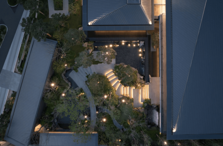 园林景观:承袭千年宋风礼制,以《千里江山图》为蓝本,打造宋风山水庭院,山、石、水、林、瀑、松、径、廊等元素处处彰显宋式美学的轻盈雅致。园区内 18 棵高大挺拔的油松,以及乌桕、红枫等中式意境植物,营造出一步一景的诗意氛围。