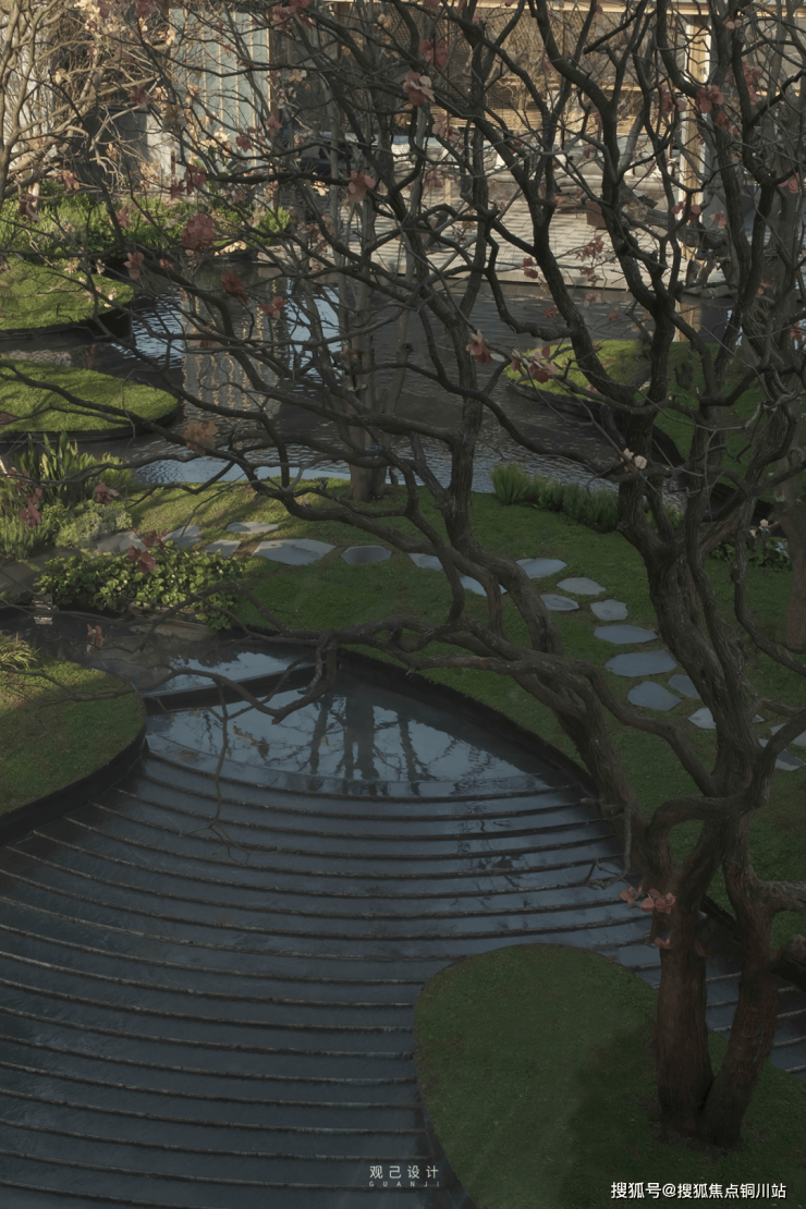 精选5棵丛生乌桕木植于下沉水院边界中,婀娜树形舞动在临水观景卡座之上。瀑布带来的微风,舞动乌桕,为休憩空间增添自然的动态美感。