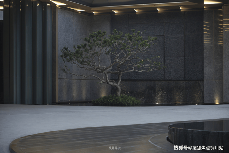 双层叠水缓慢流动,微风吹拂,带来平和的心境。斜飘冬青的造型,在富有肌理的大理石上构成光影画卷。