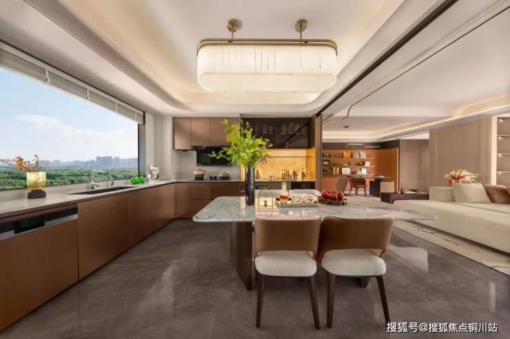 设计师还巧妙利用“横向延展+纵向通透”的复合策略,将传统豪宅的“厅室分离”升维为“无界交互场域”——父母在厨房备餐时可与客厅玩耍的孩子互动,书房与客厅的玻璃隔断则兼顾办公隐私与家庭陪伴。