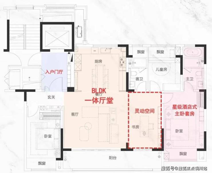 在户型设计上,在空间维度突破的加持下,创新的BLDK(阳台-客厅-餐厅-厨房)一体化设计,打造约40㎡洄游式阔厅,打破传统割裂,促进家庭互动。