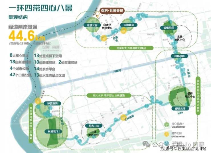 将与黄浦江滨江步道形成 “滨水 + 滨江” 空间闭环,构建 “一环四心四带八景” 景观结构。