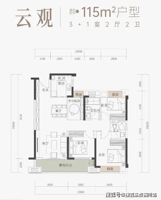 115㎡户型是端户,采光视野良好。室内采用3+1房2卫设计,客厅、次卧及主卧三面南向采光。