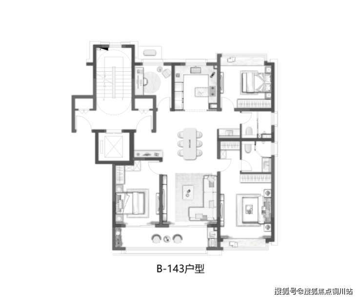 •经典四叶草户型,四个房间分布在四个角落,户型适配性高,二孩、三孩家庭都能满足。且四个房间互不打扰,私密性高。
