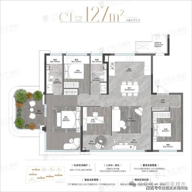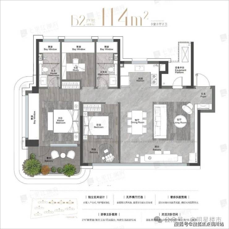 更值得一提的是,该户型为东/西边户,拥有三面采光、270°观景面,露台都是与主卧相连,成为主人私享空间。