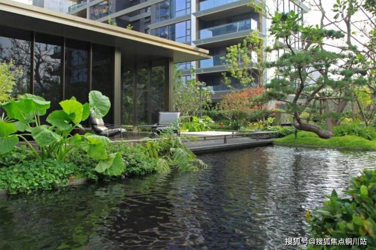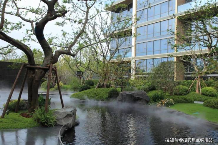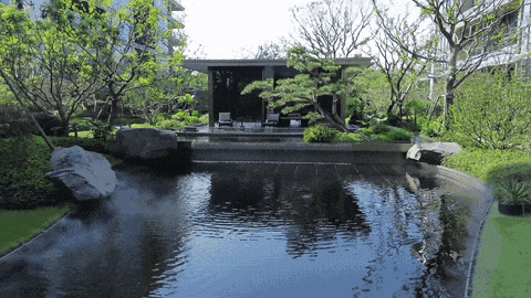 由动至静的流线型水景,住区入口为起点,一路顺流而下,形成一条贯穿整个林间的水景丝带,线条流畅自然,与周边场地道路、地形植被交错掩映。极简的镜面水景结合丰富绿植,潺潺跌水为溪流注入活力。池底为防止返碱采用胶泥薄贴,整体铺装完成后所有铺装缝为防止返碱积灰,采用黑色填缝剂进行填缝施工。