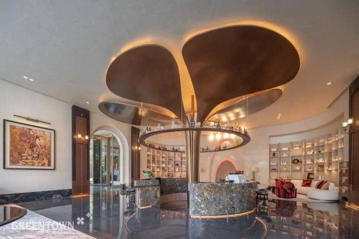 西安锦海棠吧台,以抽象化的海棠花线条语言,结合特殊材质、光影等元素,打造细节精致的生活场域。