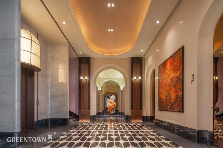 绿城在项目中不仅注重门头意象,更深入挖掘地域文化精髓,将海棠花形态抽象化演绎,融入各处的设计语言,让园区散发人文芬芳。如长沙锦海棠归家大堂顶部金属格栅柔光光幕,取自非遗湘绣技法的经典海棠织锦纹,满目艺术气息。弧形线条、艺术拼花、压花玻璃等海派技艺展映入眸。