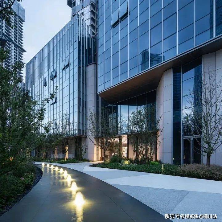 与此同时,为了让建筑在江景中显得不突兀,设计团队采用公建化立面营造高冷的形象,通过全玻璃幕墙和铝板的配合,形成通透的镜面。