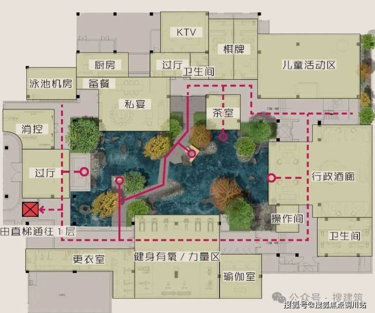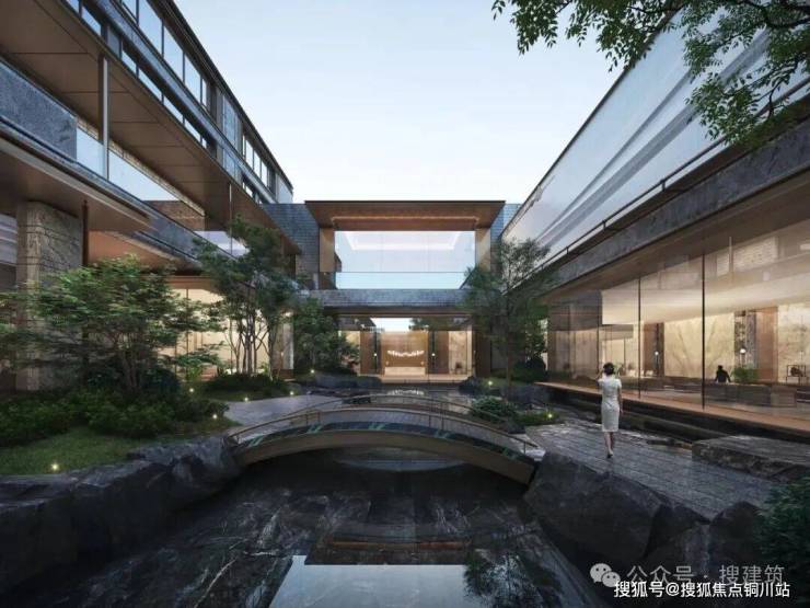 下沉水院借层层叠级引水流汇聚碧池,跌水显自然流动感,池水映建筑,添漂浮意境,水与建筑相融共生。