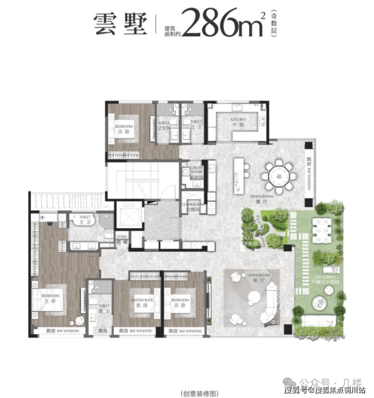 不少购房者喜欢这个户型,大概率就是看中了端厅+空中花园的搭配,约6米大开间的环幕厅设计,搭配巨幕落地窗,整体采光、视野极佳。