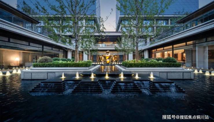 下沉式庭院「浮岛花园」里,是一片水上树阵。高大的娜塔栎、优雅的鸡爪槭,会在秋天变红。涌泉和水流的声音,带来了「蝉噪林逾静,鸟鸣山更幽」的静谧感。中轴对称的形制,中间一座太湖石意向雕塑,这就是翡丽甲第讲述的经典故事:东方的语境和氛围,西方的结构和风情。