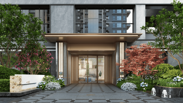 这个尺度比河西很多千万级的豪宅还要奢阔,选材方面也很顶,天然石材与铜色金属搭配,造型罗汉松+中心处古石榴树+水景,归家仪式感拉满了!