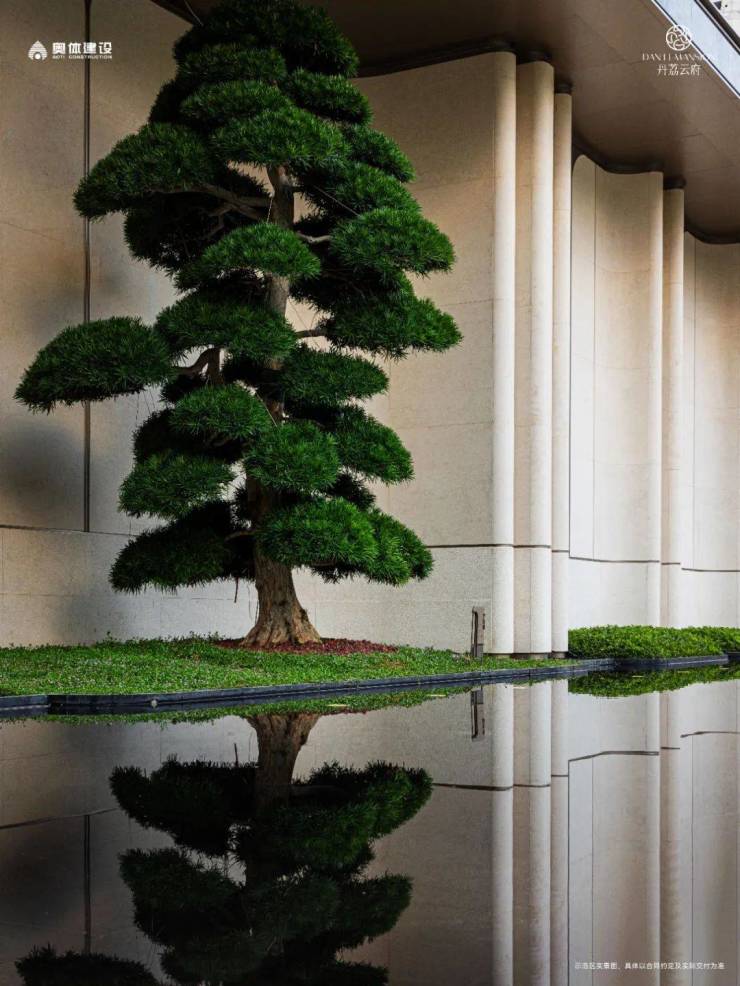 大面积使用的保加利亚进口维纳多石材,是米白色的高级质感,与顶部柬埔寨进口温德姆灰大理石形成撞色,主入口的迎客松、门庭两侧的对称迎宾水景加以点缀,极具视觉张力。