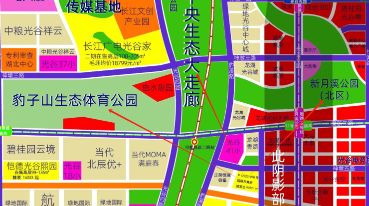 书包:书包配置高:距离光谷41小约500米、光谷18小直线距离约1.5公里、新城实验中学(六初)直线距离约1公里。项目所在片区内都是双书包的配置(18小+37小)。