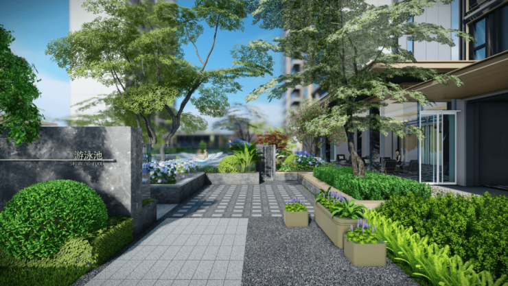 归家动线:住宅区双入口设置,实现分区分流。车行入口置于北侧大港六路,坡道结合裙房,实现人车分流。主入口结合 60 米礼仪广场,采用三进式布局,一进酒店式大堂,摩登典雅;二进迎宾回廊,静水微澜;三进中心泳池,碧海晴天,层层递进,打造沉浸式归家体验。
