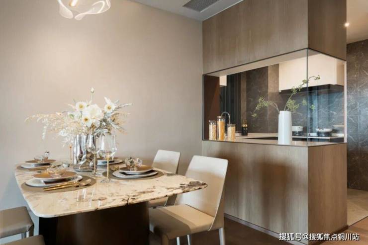 而在江城府,用玻璃栏板代替移门,让通透的视觉效果放大,更让厨房与客餐厅有了完美的无界感。