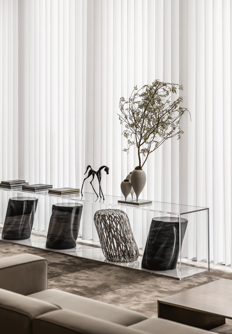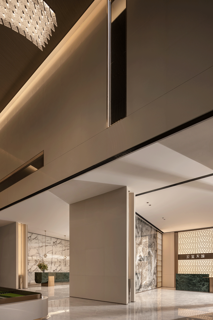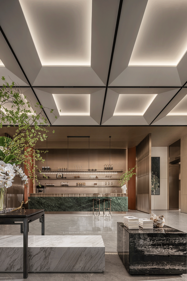 前厅设计结合了东方元素与现代主义的极简美感。由量体、规律的线条将空间简约化、现代化,中式漏景的若隐若现、含蓄雅致,则为斑驳的光影赋予新的形态;二者融会相济,展现着现代东方空间的舒适与惬意。