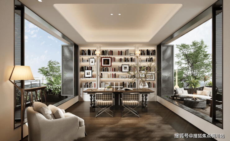 四楼连接书房的是一个超级星空露台,在这里,进可文艺,退可居家,将露台打造成空中花园、茶室、健身房、书房等多种生活场景,实现真正意义上的空中“百变场域”。