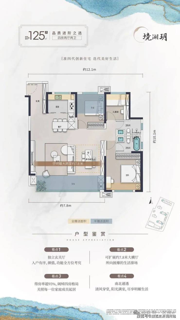 建面约125平的户型,优化后实得套内面积可达约116平以上,相当于三代住宅建面约145平以上的户型。