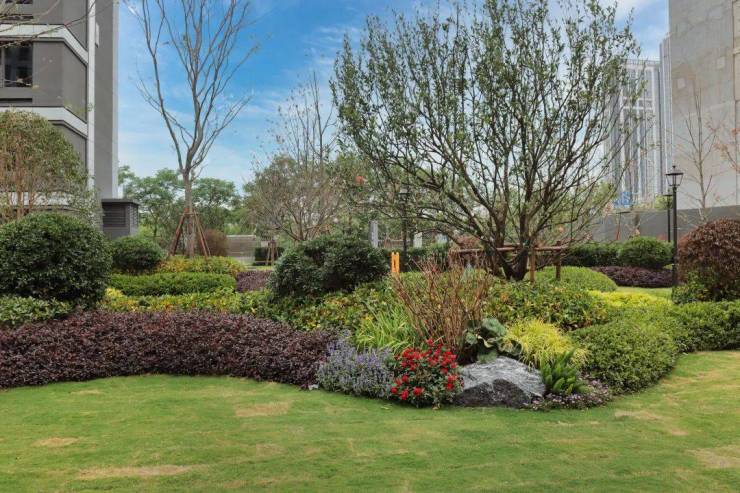 内部绿化景团更是丰富,四季更迭的花卉、树种、树冠都经过精心搭配;每栋楼栋前还都有一个“宝藏”花园,色彩明亮饱和,在有限的土地上丰富绿意,真正做到庭前皆为景。
