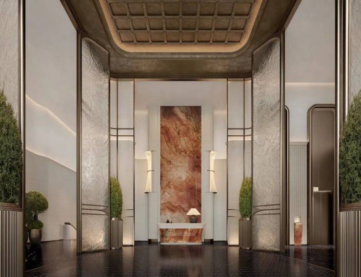 社区门庭上,纯古铜鎏金水波纹,由数十位非遗匠人以“双面錾刻”技法,历经数百天打磨而成。中央车站式大厅、社区尊奢会所、私宴厅、会客厅、行政酒廊与私属下沉庭院等豪宅标配一应俱全,营造“元萃雅集”的生活主场。