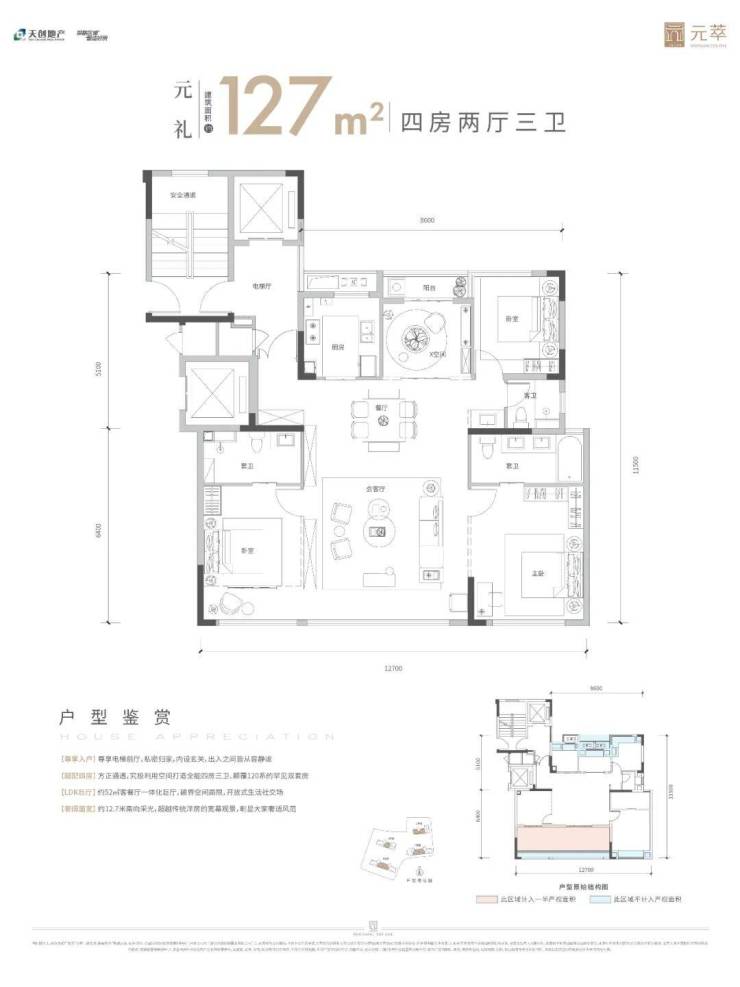 建面约127平户型,方正通透,做到四房两厅三卫,是同面积段内罕见的双套房设计。约52平超级会客厅,今后是业主的社交主场。