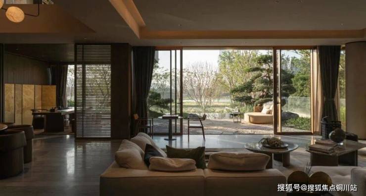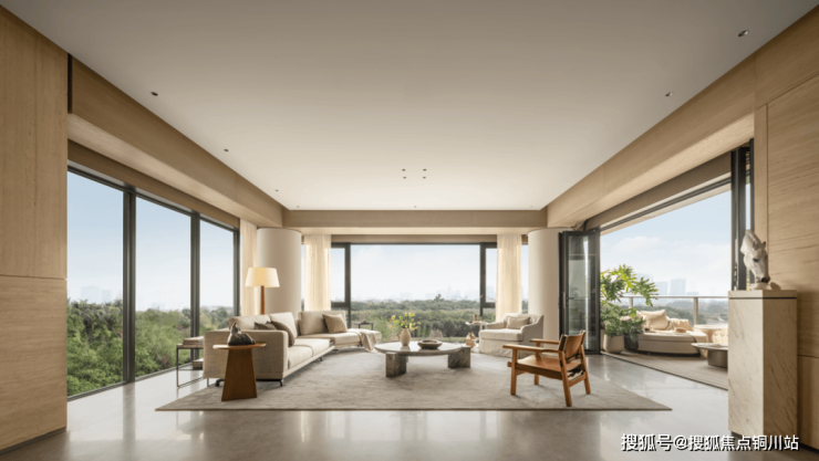 无独立柱设计的餐客厅一体化空间,以超10米南向面宽,引光为景,纳院为画。整墙落地玻璃将绿意延揽入室,模糊了建筑与自然的界限,也融化了人际的隔阂。