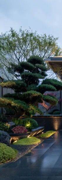 百年罗汉松·云松迎客:对称植于主入口,形成“门第仪式感”,如两位老者躬身迎宾,是东方“待客之礼”。