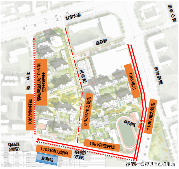 高压线路下地: 将影响市容的 110KV超高压电力管沟、10KV 管道迁改地下,马场路南侧电力盖板实现隐形化改造,彻底消除空中线缆杂乱的视觉污染,同时规避电磁辐射隐患。