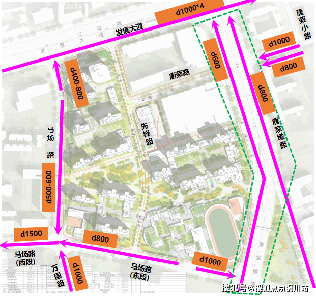 微循环补位:新建20米宽双向2车道的马场一路、12米宽双向2车道先锋路、15米宽双向2车道唐蔡路,直接连接发展大道与马场路,形成“内场外联”的路网闭环,到二环仅5分钟、江汉路10分钟。