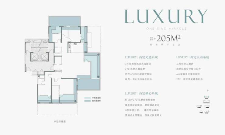 中海峯境叁號院作为市场上四代宅的升级2.0版产品,在户型设计的细节处理上,实现了升级和优化。以205平方米的户型为例,项目首次引入郑州的主卧套房双全景舱户型,双面采光带来超级居住享受;南北两侧设置浮岛式立体绿化阳台,与敞阔宽厅、主卧套房贯通,更大限度改善和满足采光通风和居住尺度需求。