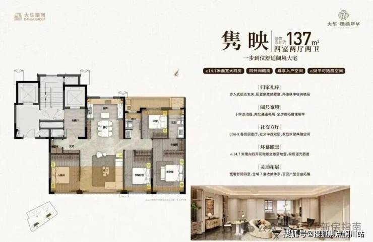 137㎡四房户型,四开间朝南,可拓展面积约38㎡,拓展后综合得房率约102%,轻松实现真四房舒适生活;南向采光面高达14.7米,让更多起居空间都能享受到阳光的浸润。