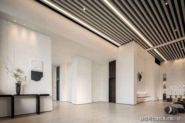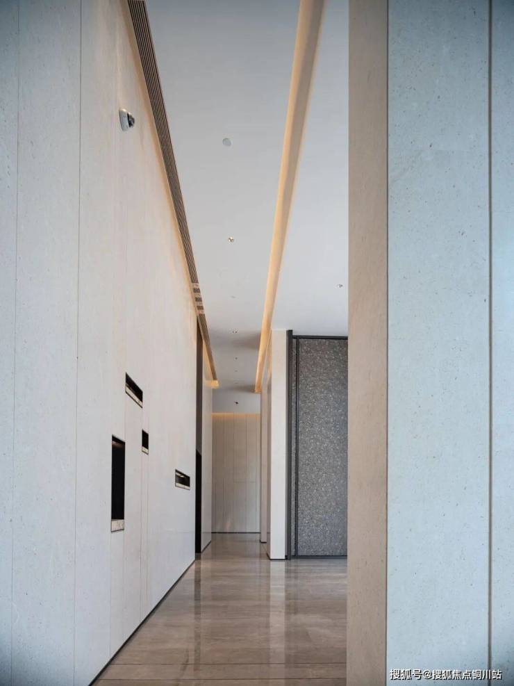 入户大堂净挑高约9.6米,刷新武汉豪宅挑高纪录。地面采用国际灰石材,迎面墙超白洞石材分布着犹如芝士切面的小洞,一灰一白,质感温润。金属壁龛错位镶嵌在迎面墙中,巴西奢石的纹理犹如宣纸泼墨的意境。