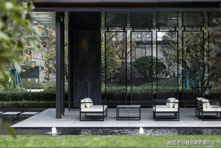 室外会客厅旁,涌泉水景环绕,浪淘沙花岗岩源自稀缺老矿,屏风隔绝出一方共享互动的天地。业主对弈、阅读或聊天,抬头,透过雕花艺术屏风,满目苍翠,美不可言。