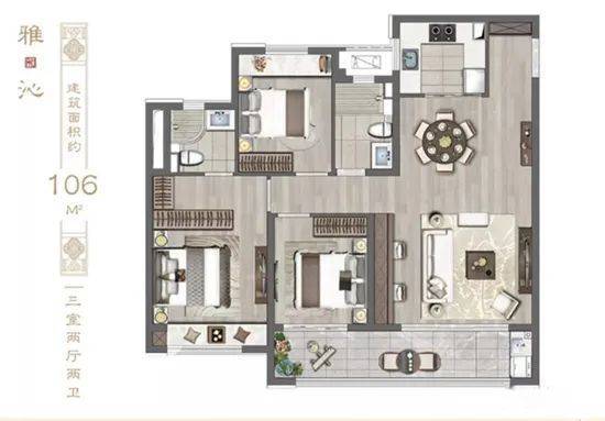 建发和著106㎡户型,为三室两厅一厨两卫设计,主卧、次卧、客厅三房朝南,客厅和次卧连接南向宽景阳台,采光好;U型厨房的设计,扩大了操作空间。