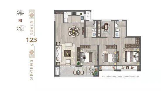建发和著123㎡户型,为四室两厅一厨两卫设计,客厅、主卧和双次卧四房朝南,采光好,保证了居住的舒适度;双卫设计,满足多口之家的需求,采光好。
