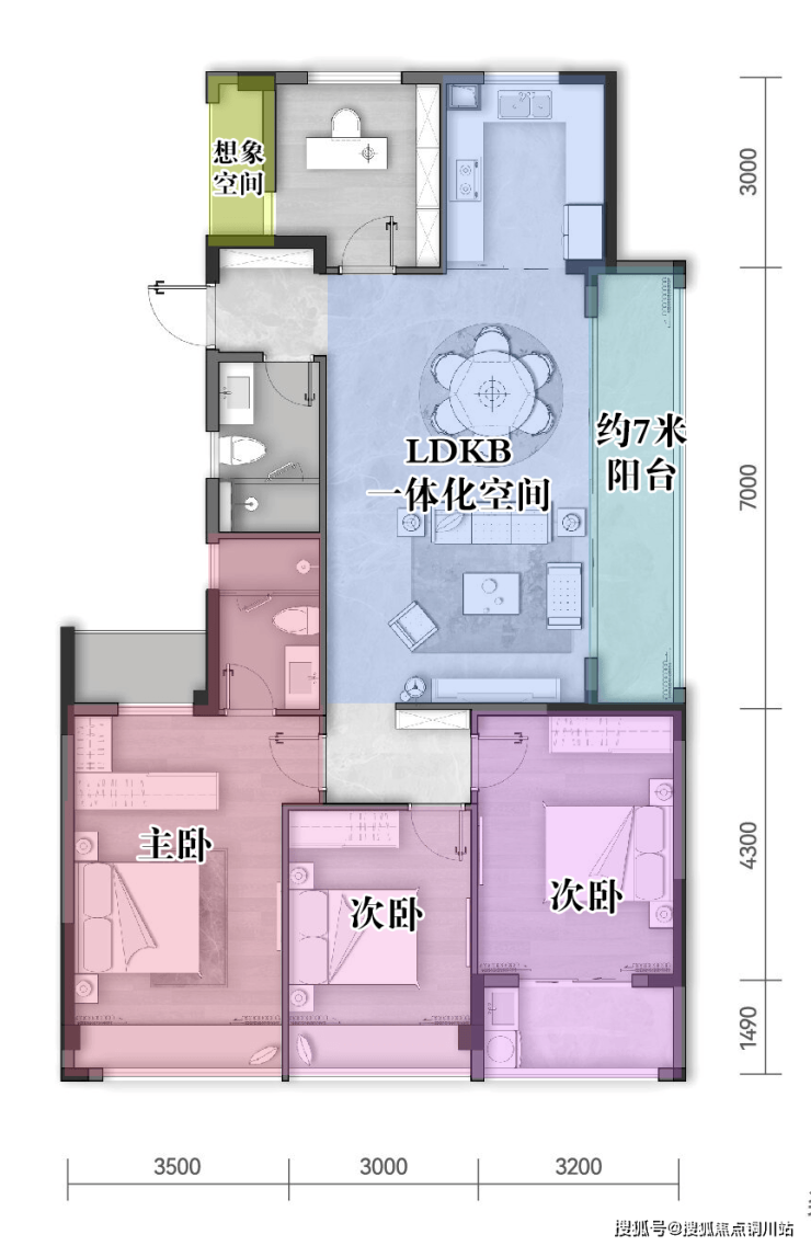 东面连接约7米阔绰阳台,套房式主卧,带飘窗、衣帽间和卫生间,全面覆盖男女主人的生活所需。周末坐在飘窗上看书喝茶,累了就靠枕小憩,还可设计为收纳的地方,为空间扩容。
