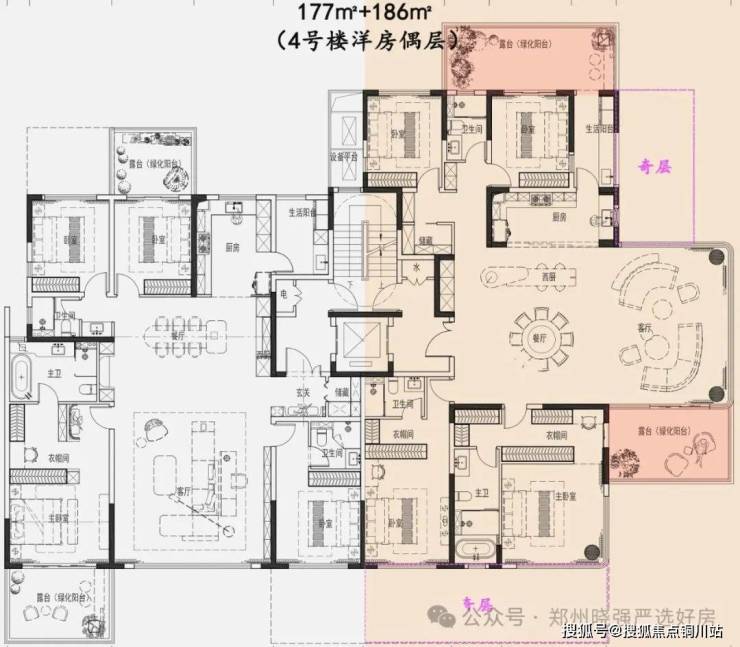 再接下来是4号楼上14套186㎡平的洋房边户,以「客厅主卧双270°环幕采光」为核心,打造MAX天幕全景舱光厅,约72㎡游轮级社交主场串联南向全场景悬浮绿化阳台,形成无遮挡观景视野的沉浸式光感空间。