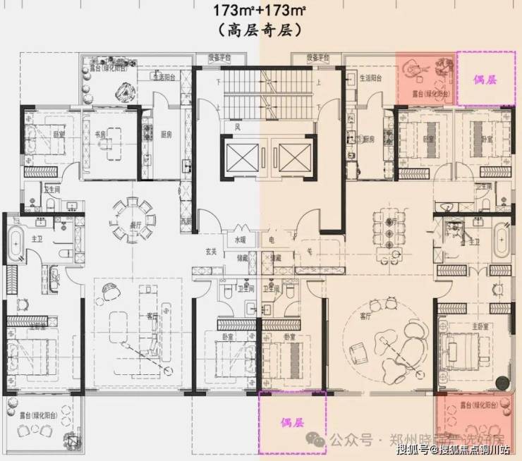 在户型上,中海峯境叁號院以6种面积段、6大主力户型构建纯改善产品体系,其中建面约173㎡高层主力户型规划260套,占据1/2/3/6号楼共4栋高层。该户型以「奇偶错层南北双向露台+两梯两户独立入户+约13米光合巨幕」为核心亮点,打造南向3.5倍面宽采光系统,约60㎡社交级客厅承载多元场景。