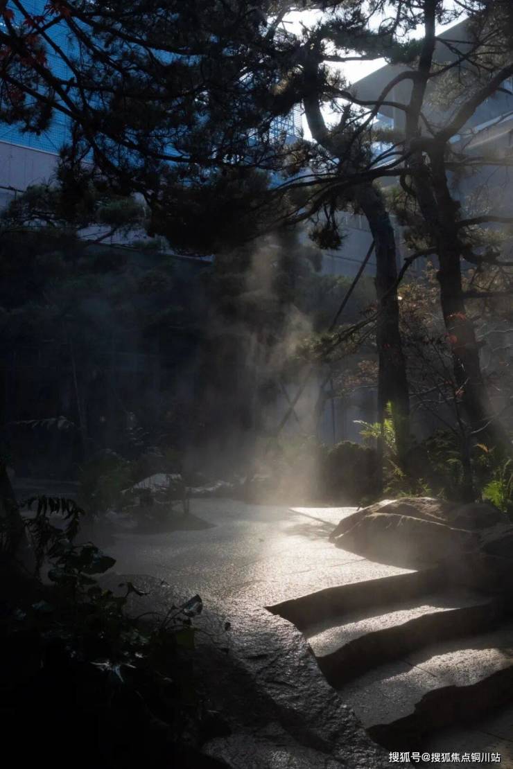 九株全冠油松以雾森为纱,在晨昏中勾勒出“松枝邀月”的剪影,脚下忽闻水声潺潺,是设计师用“八音涧”的智慧,让飞瀑在青石上弹奏的《高山流水》。
