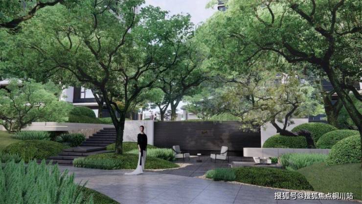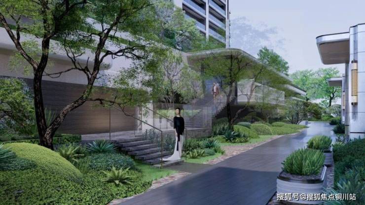 5、11号楼南侧的一、二级阶梯过渡带,以景墙构筑「微型悬崖」,宽敞的石阶从缓坡间延展开。