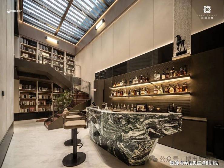 🔹归家第一步,即是身份的彰显。叠拼专属独立归家入口,以香槟色金属格栅与暗金色浮雕勾勒门庭气质,两侧星耀灰大理石立柱奠定庄重基调。入口处取意东方园林意境,借自然之韵,融雅石、花木与疏影,勾勒出一幅“移步异景”的园林画境,延续东方美学的栖居理想。